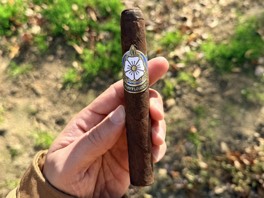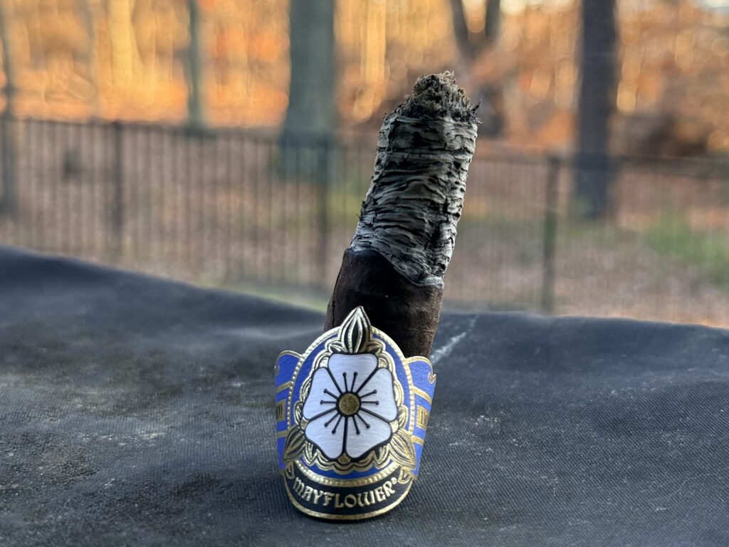 Mayflower has the best cigar band in the business in my opinion. The symmetry, the gold foiling, the clean lines, and clean shapes are very attractive. There is a nice deep royal blue behind the flower that makes it pop. Towards the back of the band has a cloud like dreamy feel to it. The flower is bold but elegant at the same time. I like that it a is die cut band as well.Â