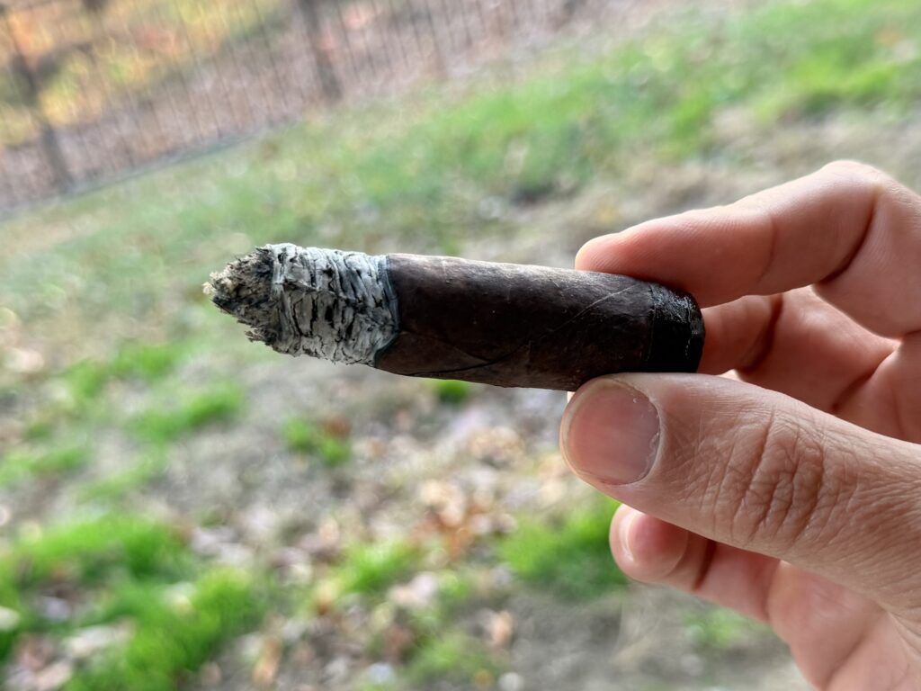 No need to correct the cigar even though the burn is semi wavy. The draw and smoke output remains the same as the previous thirds. The notes in the last get a little bit warmer and a little more intense. A strong oak is at the forefront. There is a sweetness that reminds me of a nice warm bourbon. Following that, a soft leather from before along with vanilla extract. The retro definitely gets kicked up a notch in the last third. A lot more black pepper coming out, stinging the nostrils and then following that black pepper is a charred marshmallow. Lots of oaky notes again on the finish. Complimenting the oak is some cream, a smidge of sweetness, and some vanilla and almond thrown in at the very tail end.