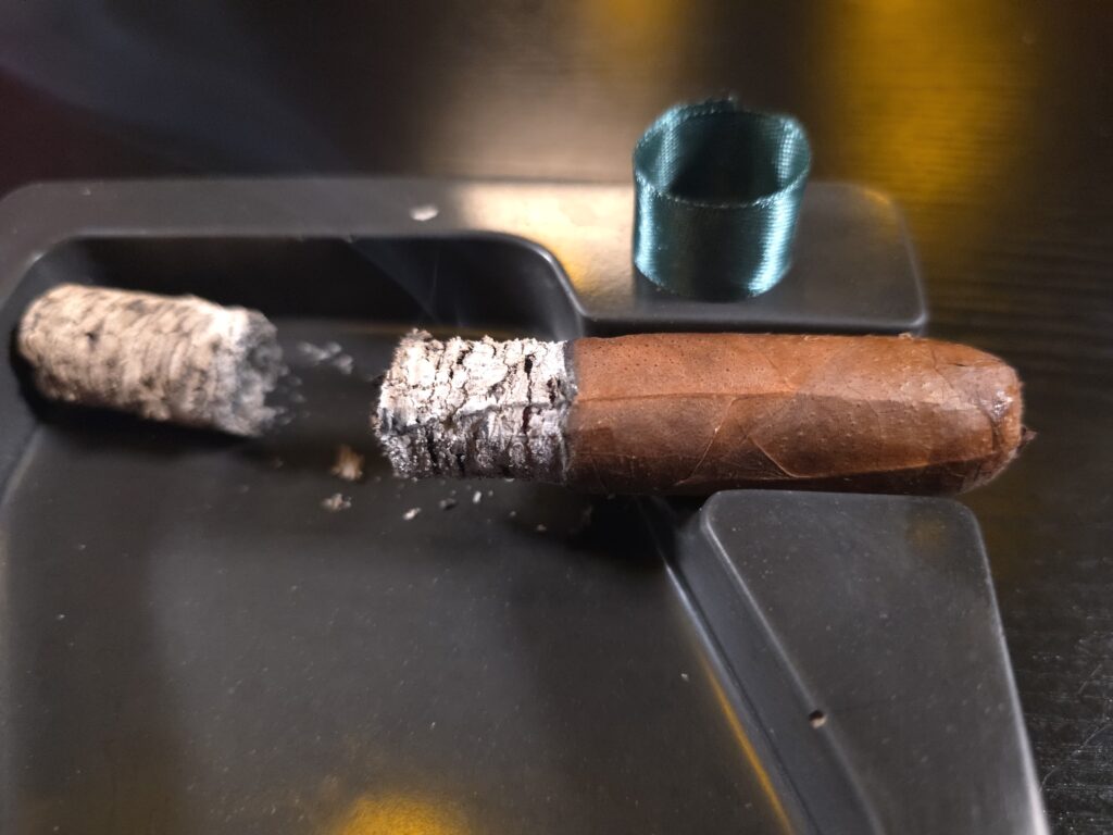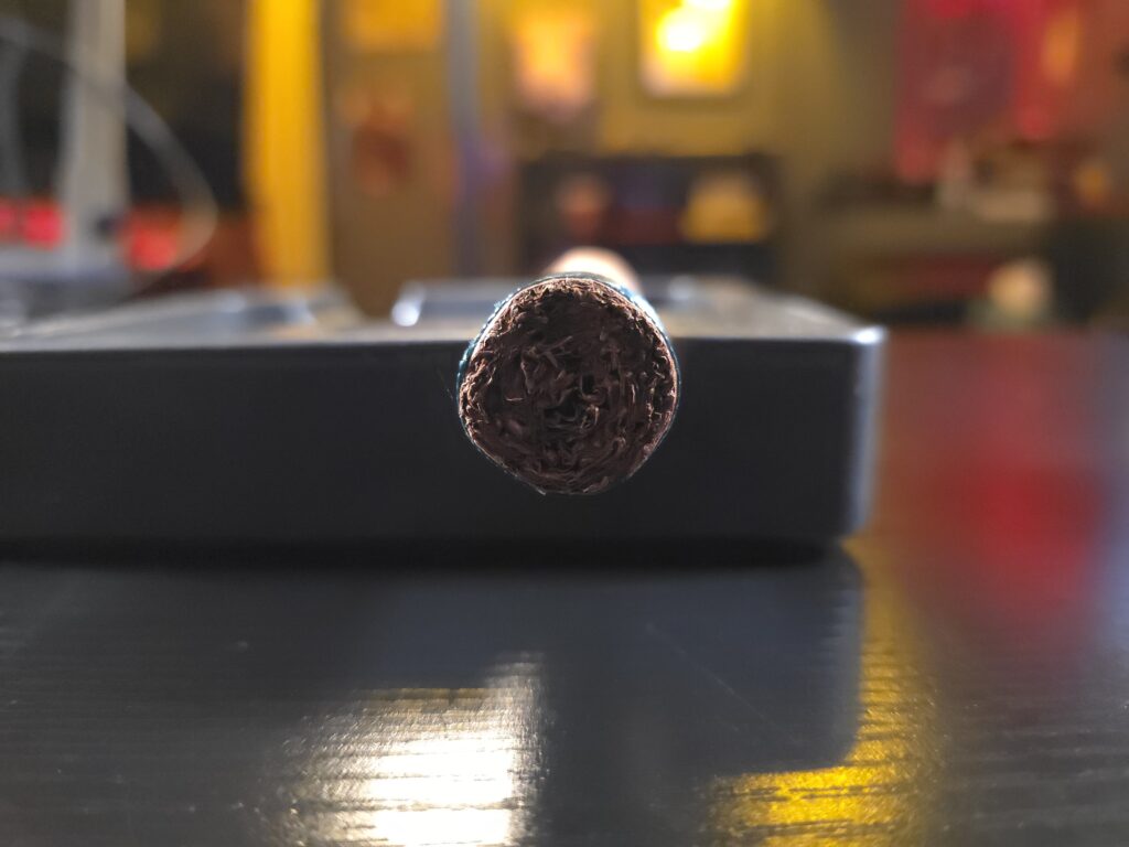 The final third sees the Verdigris go from a medium profile to a full profile. Notes of dark chocolate, charred wood, brownie, nuts, and red pepper all come together with hints of leather and earth. Black pepper rules the retrohale once again. Pepper, spice, wood, and chocolate goodness. The smoke feels less creamy and more dry, but is still voluminous. The burn is still straight, and the ash still compact. Only a few stray flakes can be found, and all are in the tray. Leather, chocolate, espresso Cedar, baking spices, and pepper. The notes all take turns dominating the profile. A herbaceousness returns and lingers on my palate. Nuts, chocolate, leather, black tea, baking spices, black pepper, and campfire is how the Verdigris ends.
