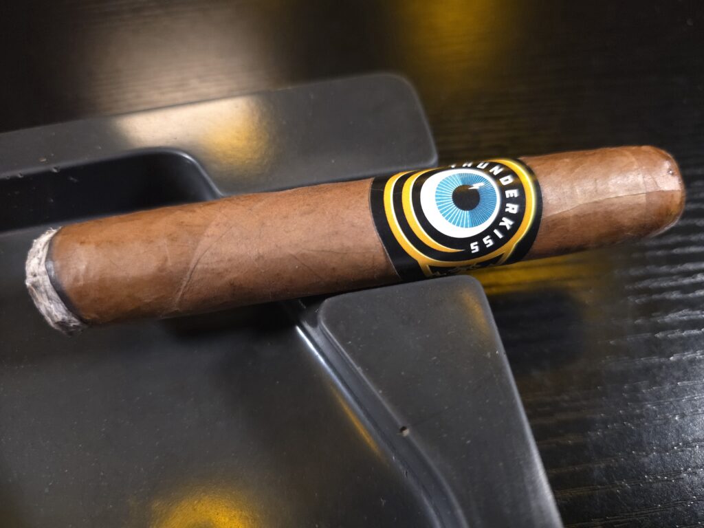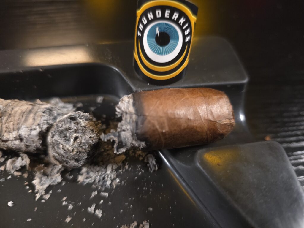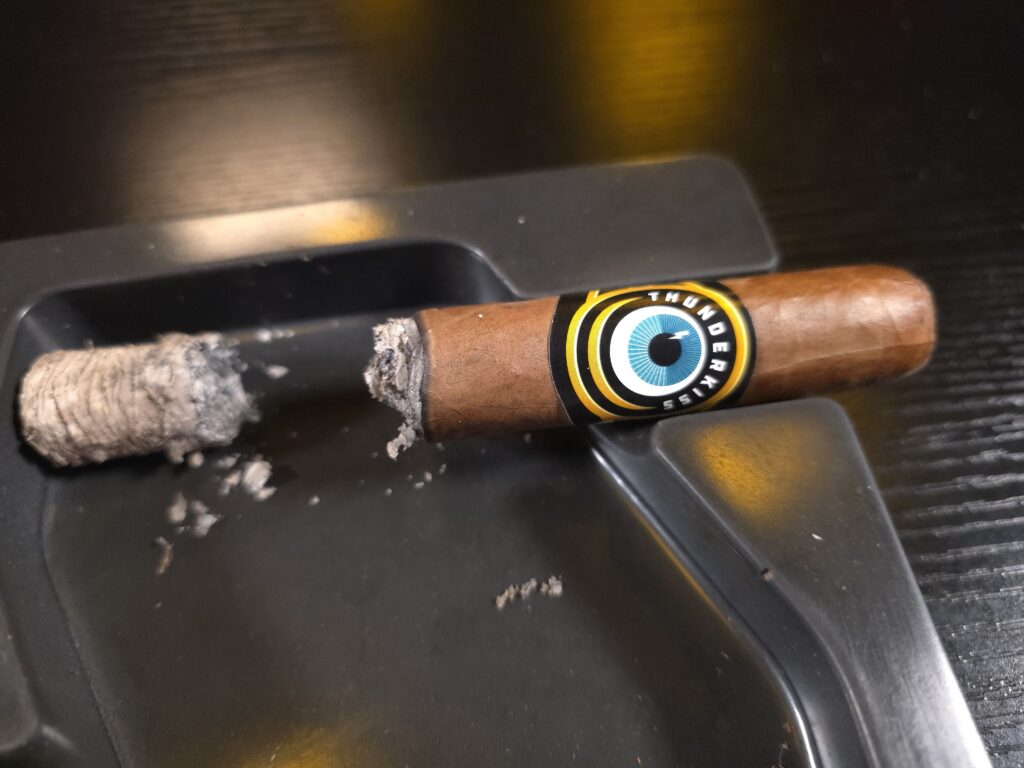Chocolate, nuts, earth, and red pepper flake continue where the initial light left off. Black pepper and baking spices on the retrohale. There is sn almost caramel creaminess to the Thunderkiss’ first third. Still spicy. The burn is almost perfect. The ash white with a few streaks of black. It resembles a stack of nickels. The sweetness sublime. It is flanked by notes of wood and coffee. The retrohale sets it all off. Perhaps a bit of herbaceousness lurks in the background. Wood lingers on my palate. Earth, chocolate, wood, spice, and pepper continue to dominate the first third. Subtle sweetness lurks underneath it all.Â